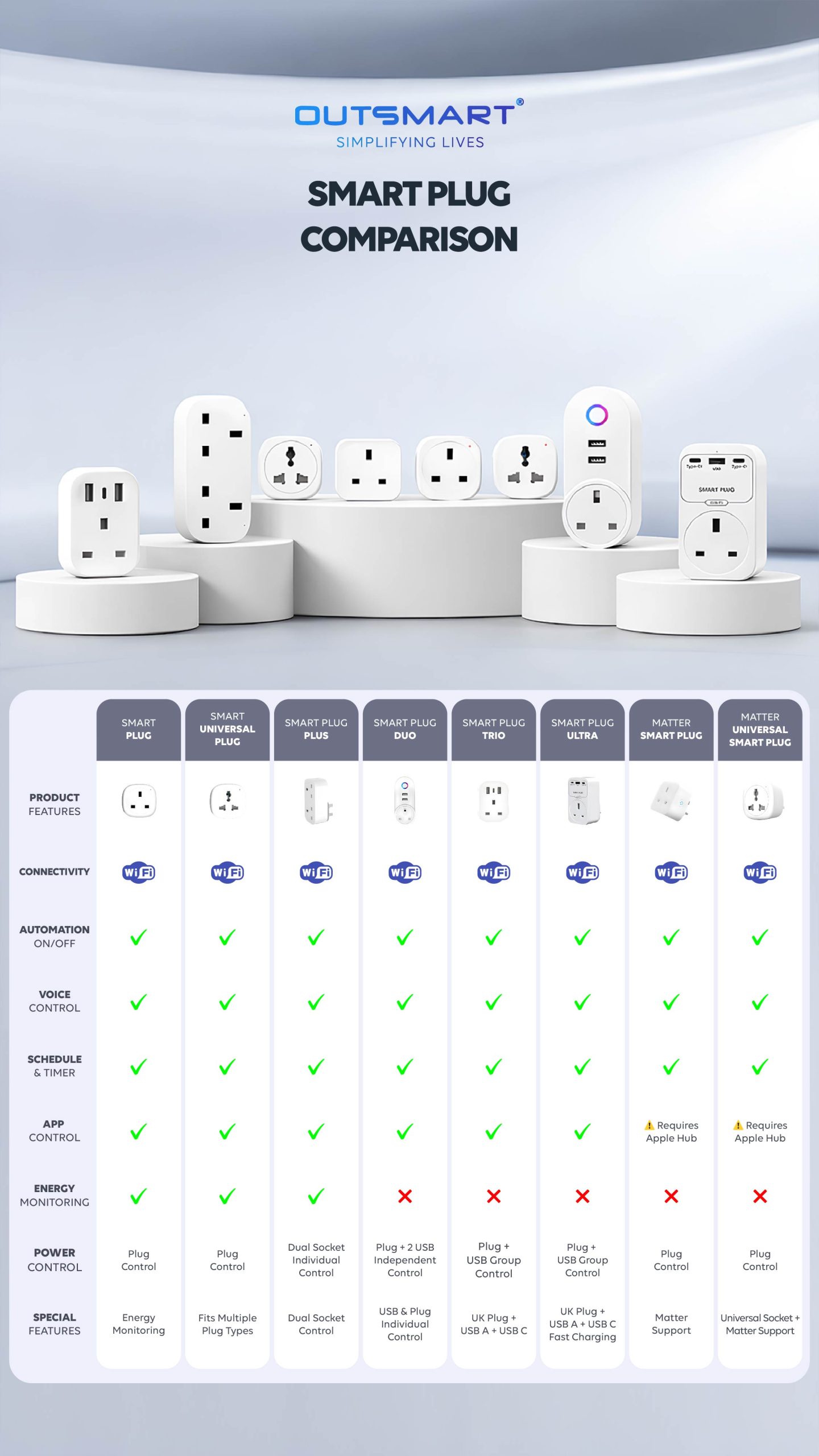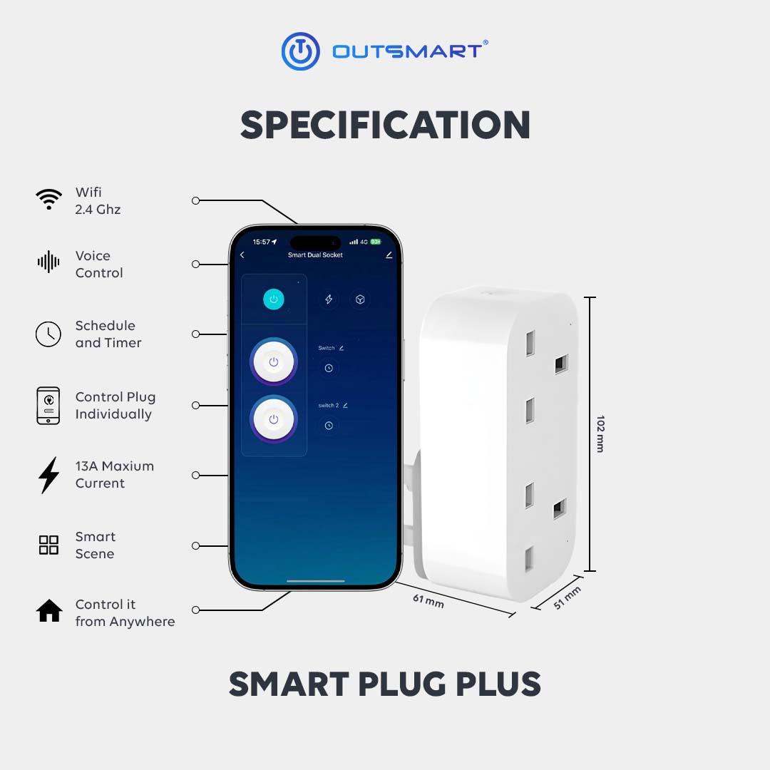 Designed to power two devices at the same time. Control each socket individually, set schedules, and manage appliances remotely through the app.